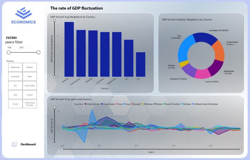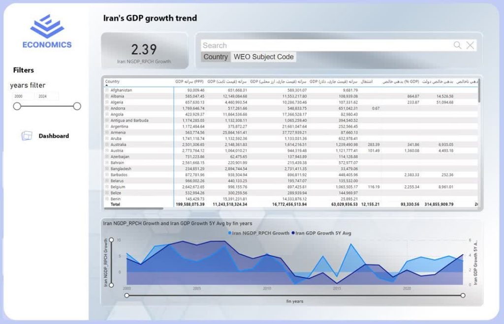 This Power BI dashboard, titled “Analysis and Comparison of GDP of Iran and Other Countries”, is designed for the Iranian economy and focuses on analyzing macroeconomic indicators from 2000 to 2024.