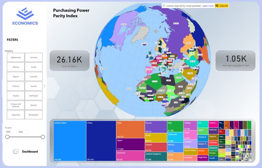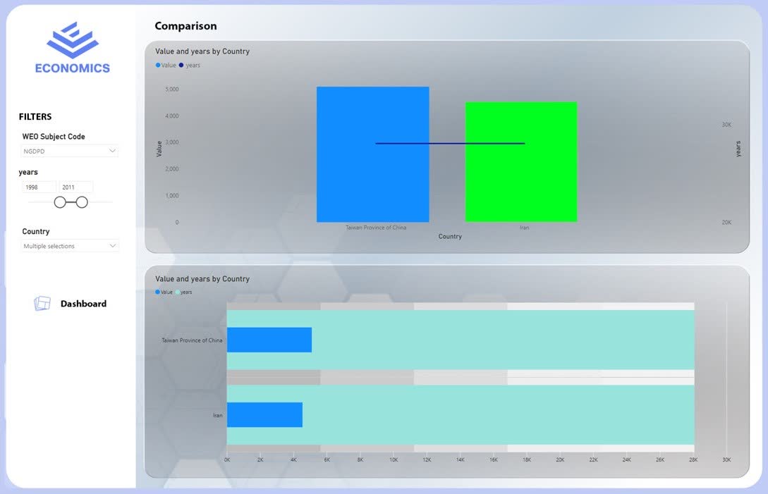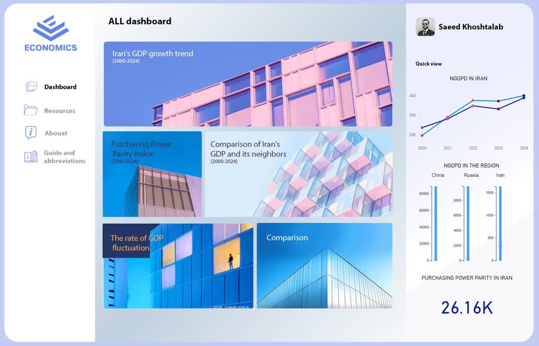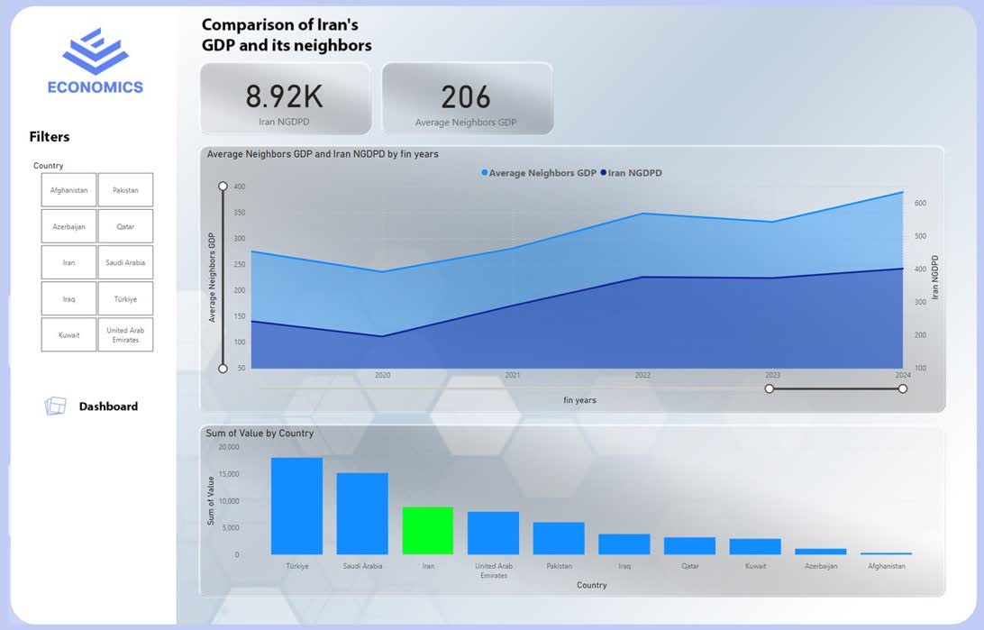 This Power BI dashboard, titled “Analysis and Comparison of GDP of Iran and Other Countries”, is designed for the Iranian economy and focuses on analyzing macroeconomic indicators from 2000 to 2024.